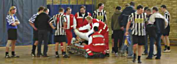 Das darauf folgende Spiel Rositz gegen Lok II wurde vom Verletzungspech überschattet. In der achten Minute stand es 2:1. Ein Rositzer Spieler zog sich bei einem Kopfballduell und anschließenden Sturz auf das Parkett Kopfverletzungen zu und musste in die Notaufnahme eingeliefert werden. Nach längerer Unterbrechung konnte das Spiel fortgesetzt werden. Rositz gewann 4:1. Bevor Roter Stern wieder dran kam, besiegte Lok III Wintersdorf mit 6:0.