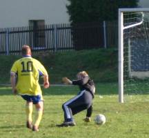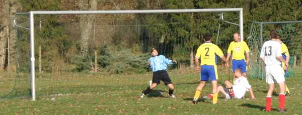 Bevor die Erste antrat, um die seit fünf Spieltagen andauernde Nullpunkteserie zu beenden, war die Zweite dran. Sie hatte zuletzt eine Serie Unentschieden hingelegt und so hatte auch die erste Halbzeit der Partie in Dobitschen geendet. Nach der Pause hatte Roter Stern zunächst mehr vom Spiel. In der 61. Minute hatte das von oben kommende Leder die Beine des Torwarts durchquert. Auf dem Bild ist es halb verdeckt links hinter dem Torwart zu sehen. Der Referee war jedoch nicht der Ansicht, dass der Ball die Linie überquert hatte.