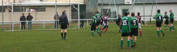 Bevor die erste Mannschaft antrat, um die lange Serie siegloser Spiele zu beenden, war die zweite dran. Bis zur Pause hatte es 0:0 gestanden. Danach schossen die Gastegeber Tore. Das 1:0 fiel kurz nach dem Wiederanpfiff. In der 66. Minute trafen sie erneut, was auf diesem Bild zu sehen ist.