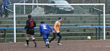 Der Spielestau mahnte zur Eile und nach ca. fünf Minuten Pause pfiff der Schiedsrichter wieder an. In der 55. Minute schoss Kese (am rechten Bildrand) das 2:0.